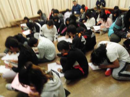 今日もすべての活動を無事終えることができました。さあ,1日を振り返りましょう。まず,自分で今日のことを振り返って,しおりに書きました。この後グループで交流します。今日考えたことを明日の活動に生かせるといいですね。