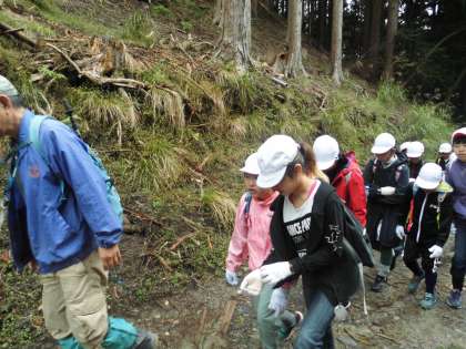 9時に玄関前に集合しました。これから「天狗杉」を目指します。リュックには山の家で作っていただいたお弁当が入っています。水分補給のためにスポーツドリンクと水筒も入れました。