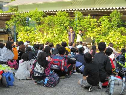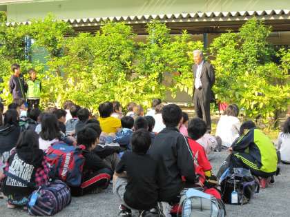 6年生は,5月18日午前7時10分に集合し,出発式を行いました。学校長より「元気に挨拶をしましょう。そして,楽しい思い出をつくりましょう。」と出発式で話されると,どの子も笑顔で「はい。」と応えていました。