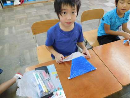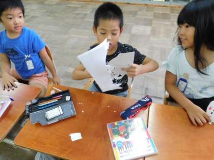 上手く立つように工夫して紙を折ったり、切ったりして、自分で考えた面白い形の作品を作ることができました。