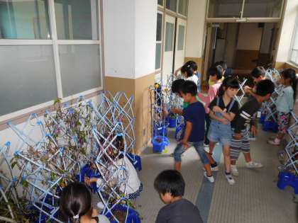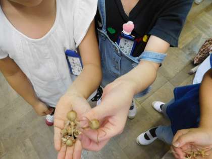 生活科でみんなが植えているアサガオの種の観察をしました。種がどのようにまとまってできるのかについて興味津々に観察していました。「タマネギみたいなものの中に4こぐらい入っている!」