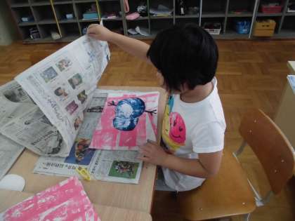 自分の表したいものを紙を切ってつなげて,ためしながら版に表しました。自分の思い通りの形や色あいに仕上がっていたことを面白く感じていました。