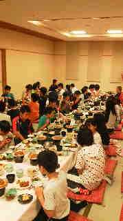 修学旅行1日目(5月18日)の夕食。みんなでテーブルを囲んで,わいわいがやがやと,この日の思い出を話しながら食事しました。