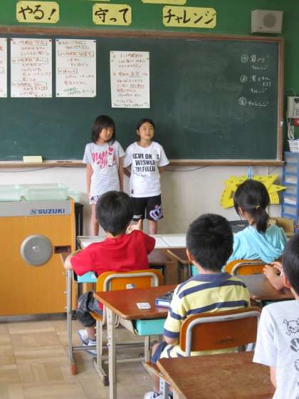 まず,その日の日直が前に出て,元気に「おはようございます。」続いてみんなも「おはようございます。」と挨拶をします。