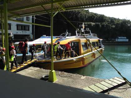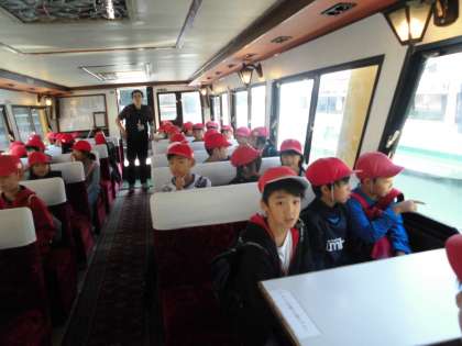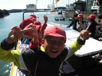賢島港に予定通り到着しました。ここから船に乗って移動します。初めて船に乗る人もいます。どきどきしながら乗り込みました。船の2階に上がってみると,とても美しい景色が見えます。海がキラキラ光っています。