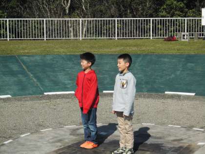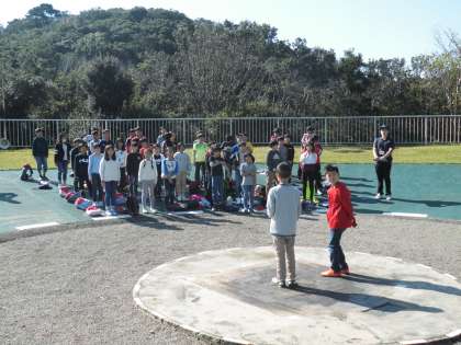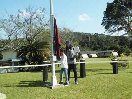 昼食後に入所式を行いました。司会進行の人が元気よく進めてくれたおかげで,大きな声で校歌を歌うことができました。2番の歌が終わると同時に福西小学校の旗がびしっと上がりましたよ。