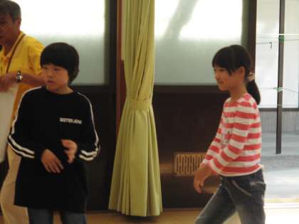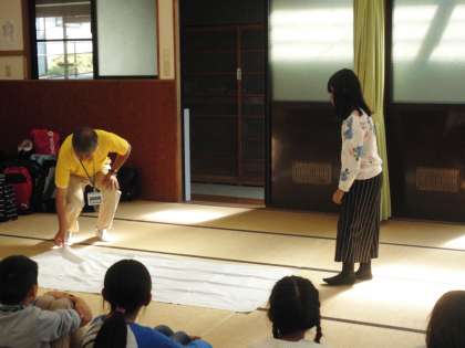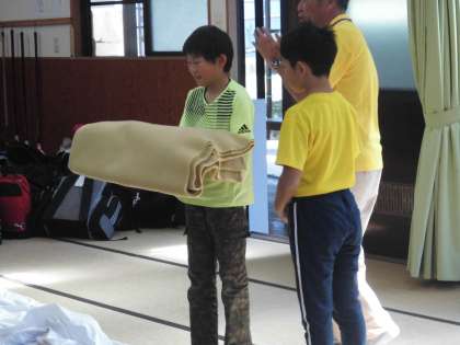次は60畳の部屋に入り,オリエンテーションを受けました。シーツや毛布のしき方,たたみ方など,前もって学習してきたので,みんなもお手伝いができました。今日教えてくださったのは,以前福西小学校の校長先生をしておられた先生でした。実は旗あげのときに校歌も一緒に歌ってくださっていましたよ。