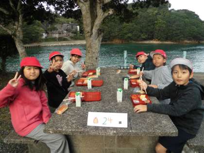 みんなと一緒に,外で朝食を食べることができるのも,宿泊学習のいいところです。友だちとの会話も弾みます。