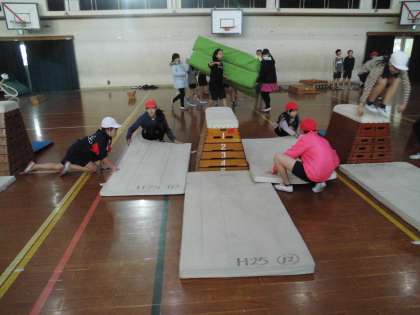 体育「跳び箱運動」の様子です。今日は2回目でした。そのため,ねらい2では,自分たちで場づくりを行い,ポイントをつかんで技を習得していきます。
