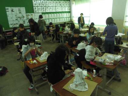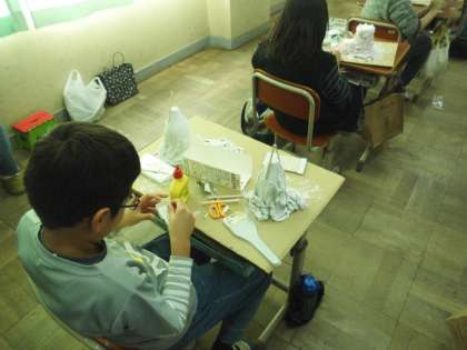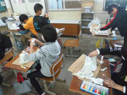 図工「トロトロ・カチコチ・ワールド」の学習でタオルを固めて,粘土や絵の具を使って,作品を作っています。タオルを組み立てたり,粘土で飾りを作ったり,子どもたちは想像を膨らませて製作しています。