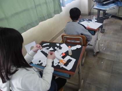 図画工作科の学習で「はさみのアート」をしました。黒色の画用紙にはさみで切ったいろいろな形をした白い紙を貼りました。大きさや貼る向きを考えながらたくさんの作品を作り上げることができました。
