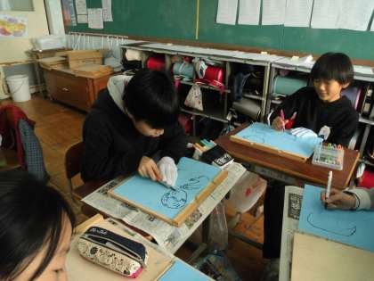 彫ってます。彫りすすめています。難しさもありますが,意外と子どもたちは楽しいようです。「もっとやりたい!」「もっといろんな彫刻刀使いたい!」という思いが伝わってきます。