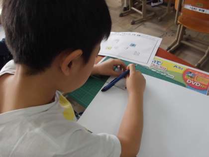 図画工作科の授業で「まどをひらいて」を学習しています。今日は,どんなデザインにしたいかを考えてからカッターナイフを使っていろいろな形の窓をつくりました。子どもたちは,いろいろな窓の開き方を考え,安全に注意しながら取り組みました。