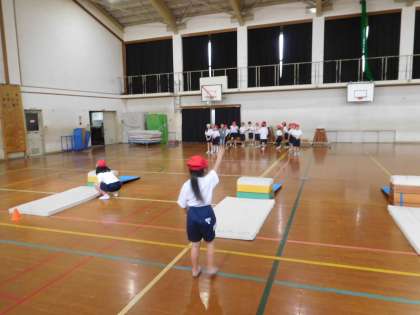 体育科の「とびばこ あそび」で、色々な跳び方で頑張ってとび箱を跳んでいます。安全確認をし、うまく跳べた時ときに、「やったぁ!とべたよ!」「がんばってね!」とお互い声をかけながら活動していました。