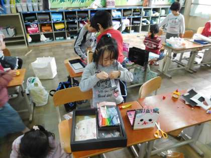 図工科の「はこ かざるんるん」で、箱に自分たちの考えた飾り付けをつけて、オリジナルの箱をつくっています。子ども達は、とても楽しみながら作品をつくっています。