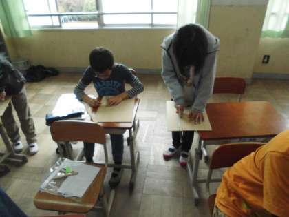 図工「ギコギコクリエーター」の学習が始まりました。なれないのこぎりで,一生懸命に木を切っています。なかなか力のいる作業ですが,集中して設計図通りに切っています。