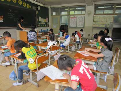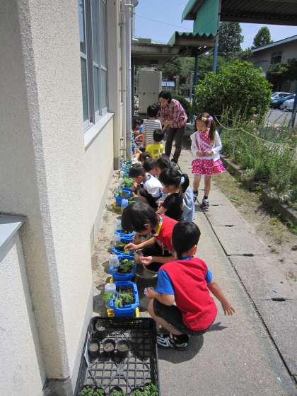 1年生は,一人ひとりで育てているあさがおに,本葉も出てきたのでこやしをやりました。子どもたちは,自分の植木鉢に粒のこやしを置いていきます。途中でにおいをかいで「くさいや。」という子もいました。また,水をやりながら,大きく育ってねと声をかける子もいました。