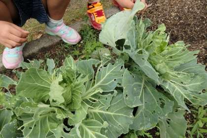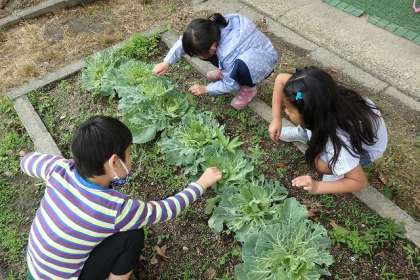 三年生の畑にあるキャベツでは,次々にチョウの卵や幼虫が見つかっています。