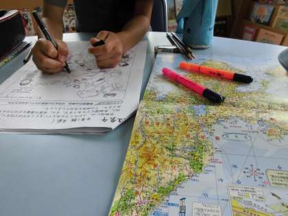 あと色を塗って気づいたことを書く問題もありますが,「色塗っておしまい」ではなく,「この色は何を表していたかな?」「京都府のこの場所には,どんなものがあったかな?」と地図と合わせて考えてみると,楽しめますよ。