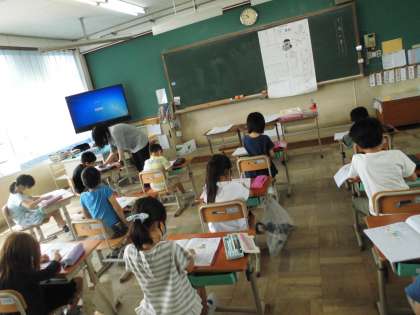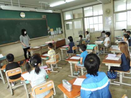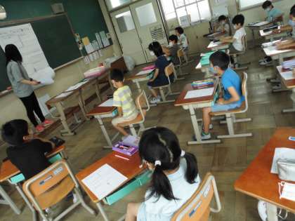 2年生のみんな,先生の目を見て話を聞き,先生の指示どおりに文字を書いていました。