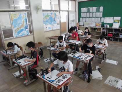 5年生になり初めての習字の学習です。今日は「草原」という字を書きました。みんな姿勢よく,集中して一画ずつ穂先を丁寧に整えて書いています。5年生の頑張るスイッチは本当にすごいと思います。また,準備から後片付けも気を抜かず,静かに集中して取り組むことができました。