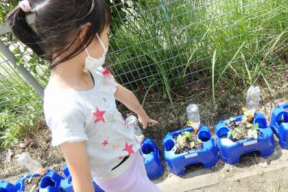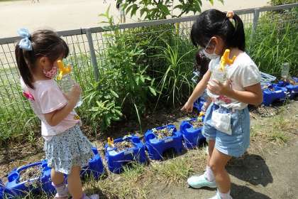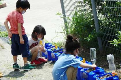 水をやりに外に出た子どもたちは,大喜びです。