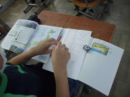社会科の学習で国土の地形とその特色について学習している5年生。今日は山地や平地について確認した後,白地図に日本の山地や平地を書き込みました。地図帳で確認しながら書いている児童も多く,とても意欲的に学んでいます。