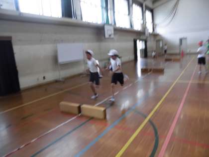 ハードル走の学習を延期延期にしてはいけないので,体育館でひと工夫。