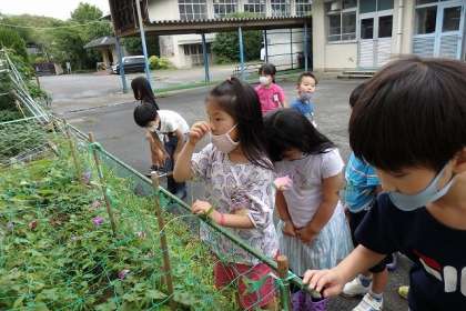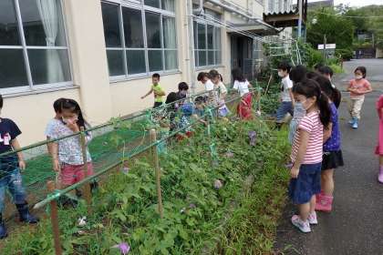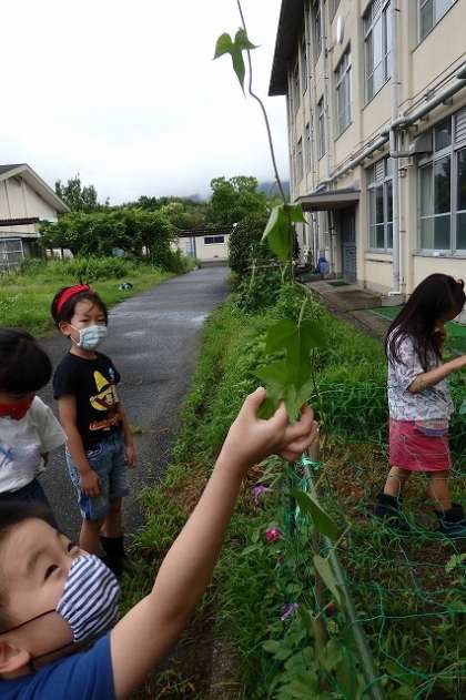 ツルも子どもたちの身長より,ずうっと長く伸びています。みんなの朝顔も,同じくらい大きく育つといいですね!