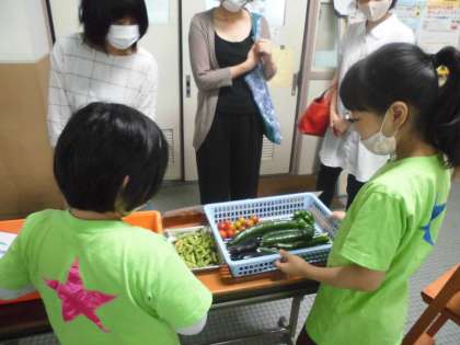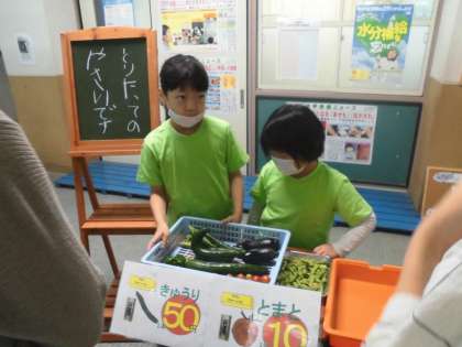 朝に収穫したとれたての新鮮野菜を販売しました。価格は野菜の大きさがまちまちなので,安くしたりおまけをつけたりしました。たくさんの人に買ってもらって,大喜びです。