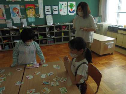 上里小学校から栄養教諭に先生が,食についての指導に来てくださいました。食べ物カルタを使って楽しく学習できました。