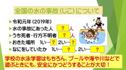 今年は,水泳学習が中止になりましたが,プールで学習するときの心得や,海や川などで泳ぐときの注意について,各学年の実態に応じて1時間ずつ学習します。