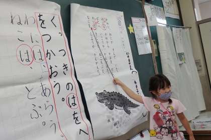 1年生,国語の難関の一つが「は」「を」「へ」の使い方です。教科書の詩を読みながら,どんなふうに使われているか確認します。