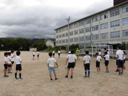 その後,タグラグビーのボールでパスの練習をしたり,サッカーのシュート練習をしたりしました。