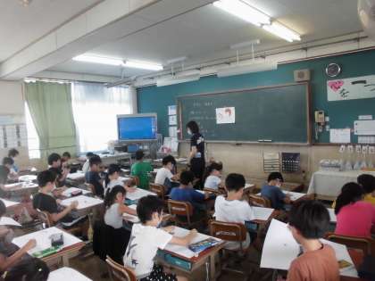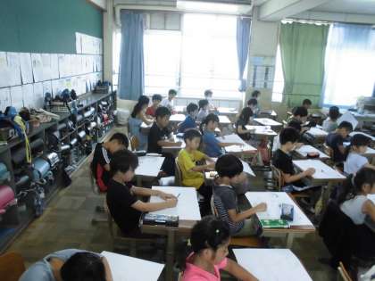 物語を聞いて,自分が選んだ場面を想像して,登場人物の大きさを考えたり,していることがよくわかったりするように下絵を一生懸命描いていました。