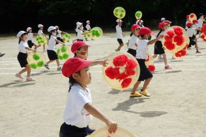 昨日,自分の花笠にいよいよ花飾りをつけました。今日の体育の学習では,早速その花笠を使いました。気持ちのいい秋の空に,色とりどりの花笠がよく映えます。