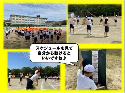 最初の練習では先生の後ろをついて移動していましたが,今日は子どもたちだけで移動をしました。横の人との間隔も,自分たちで手を伸ばして間隔をとっています。来週の参観の際は演技だけでなく,このような成長も見ていただけると嬉しいです♪
