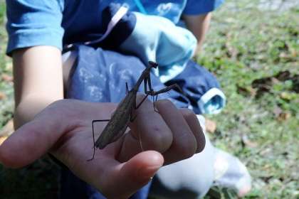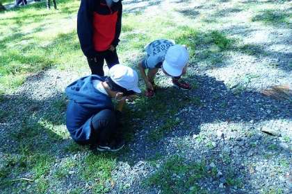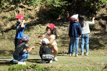 現地に着いたら,まずは休憩がてら秋見つけ!生えている木も草花も学校で見られるものとはまた一味違います。みんな夢中で探索をしていました。探索では,きのこや色々な虫を見つけることができました。