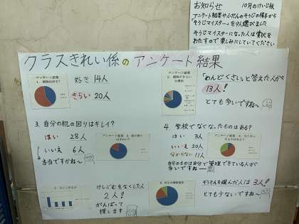 クラスきれい係が先日とったアンケートの結果を見える化してくれました。またこのアンケートから,取り組みを実施するというお知らせもありました。