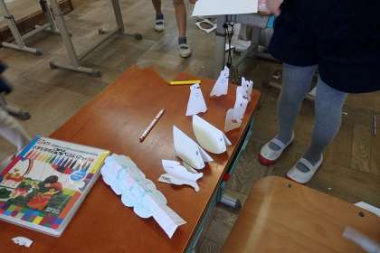 図画工作科『おってたてたら』の学習をしました。半分に折って立てたり,端を折って机のようにして立てたり,いろいろな方法で工夫しました。