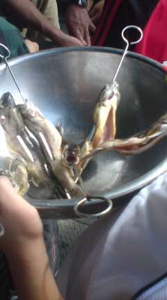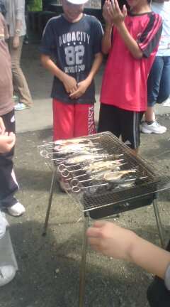 一人ひとり自分で内臓を取り出したイワナを,次に焼きます。