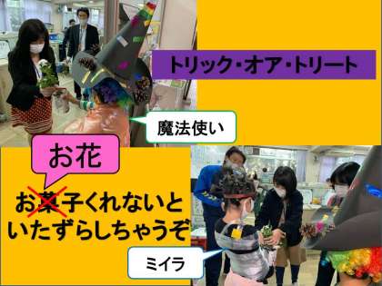 職員室では「トリック・オア・トリート」というとお菓子ではなく,お花をもらいました。花瓶もペットボトルで手作りです。
