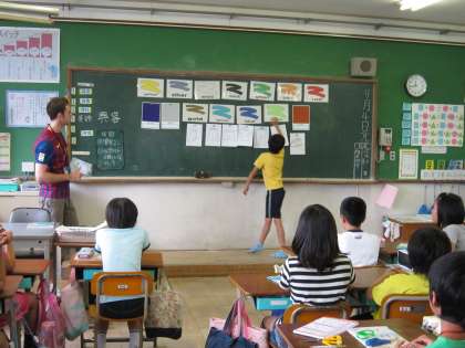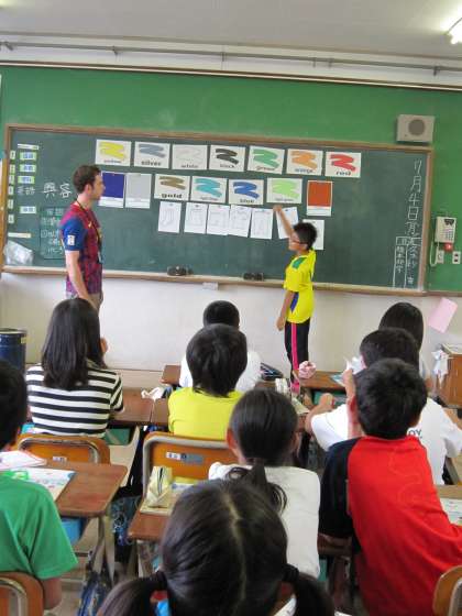ALTの先生といっしょに,英語活動を楽しんでいます。「イエロー シャーツ」と言われ,,黄色いシャツを指し示す子どもたち。楽しみながら,英語に親しんでいます。
