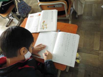 国語科は校内研究授業から,常に教科書本文を教室側面に掲示しています。
