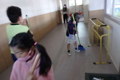 6年生と一緒に掃除したり,通りすがりの6年生に声をかけてもらったりして,嬉しそうな1年生です。