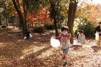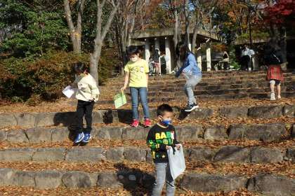 ちょうど良い紅葉の季節で,地面には秋色の葉っぱが敷き詰められ,次々に舞い落ちる葉っぱもとても幻想的でした。身近な秋をいっぱい堪能しました。