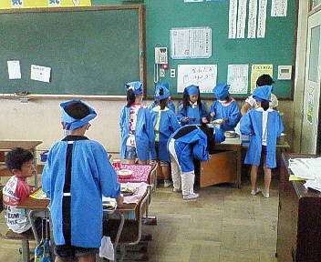 毎日12時20分になると,全校で給食の用意が始まります。さっさとエプロンをつけ,マスクをして廊下に並び,給食室へ。そして,教室へと戻ります。教室では,配膳台の上におかずなどの入れ物を並べて配っていきます。学年が進むほどてきぱきと配っていきます。写真は2年2組の様子です。