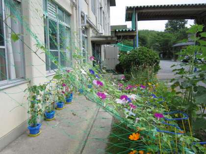 学校のあちこちに作られた緑のカーテン。