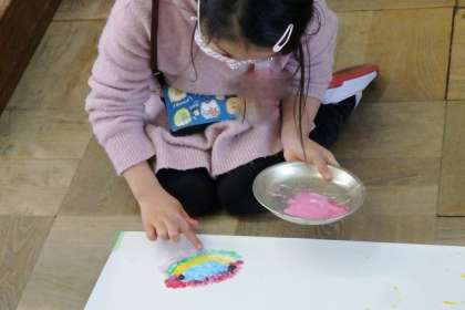 図工は版画の学習に入りました。1年生は紙に面白い形をスタンプして模様や形を描いていきます。絵の具の色を組み合わせて,繋げて押してみたり,円を描くように押してみたり,たくさん工夫してスタンプの押し心地を楽しみました。