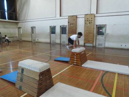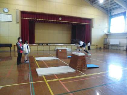 とび箱運動に取り組んでいます。みんなで声を掛け合い,細かなところまで確認しながら様々な技に取り組んでいます。